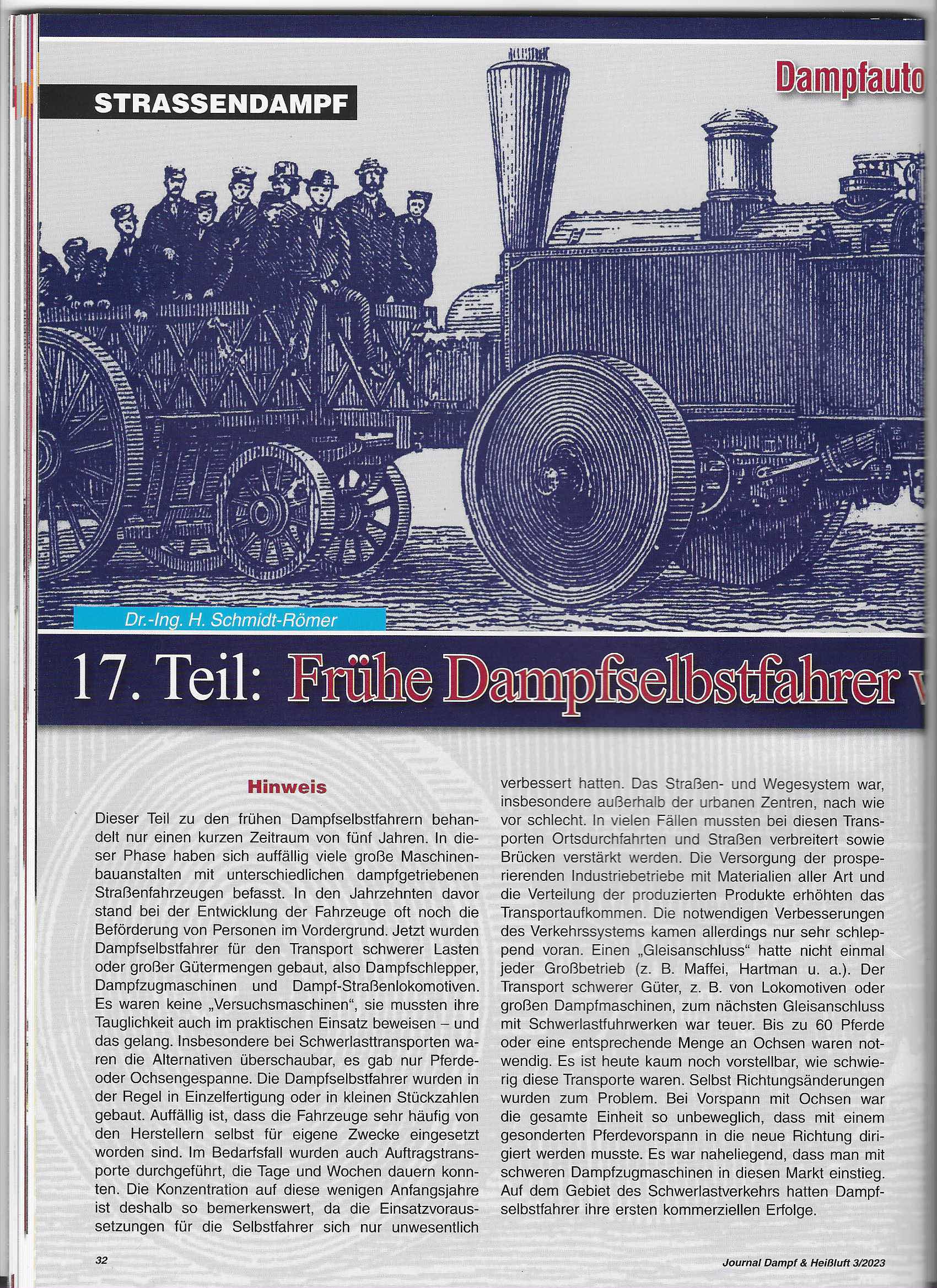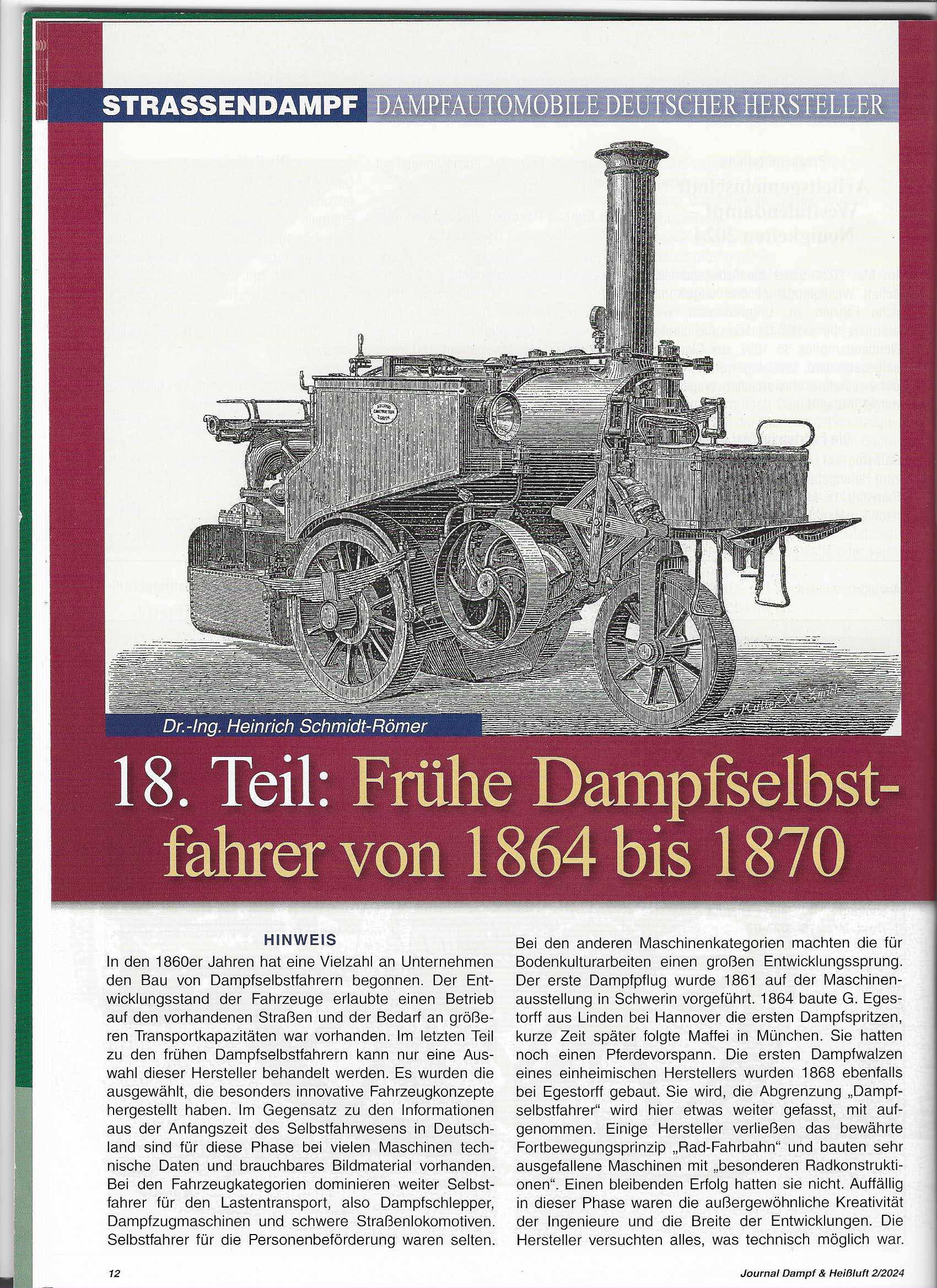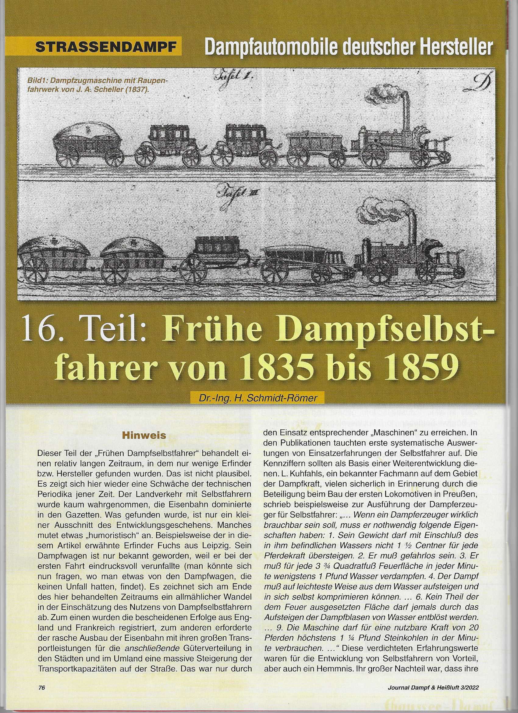 Die Anfänge des Selbstfahrwesens im deutschsprachigen Raum sind bisher wenig erforscht worden. Die folgenden Beiträge informieren über die Ideen, Konzepte und Versuche mit Dampfselbstfahrern einheimischer Erfinder. In der Anfangsphase galt es den Nachweis zu erbringen, dass „Wagen ohne Pferde“ mit einem inneren Antrieb überhaupt fahren konnten. Die verfügbaren Informationen zu den Fahrzeugen sind sehr unvollständig.
